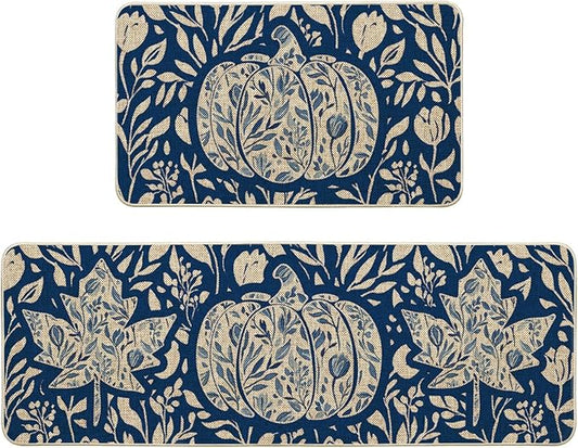 Artoid Mode Blue Flower Pumpkin Fall Kitchen Mats Set of 2, Autumn Home Decor Low-Profile Kitchen Rugs for Floor - 17x29 and 17x47 Inch