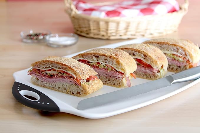 Dexas Chop & Serve Cutting Board, 12.5 by 20 inches, White with Black Handles (329-32-25)
