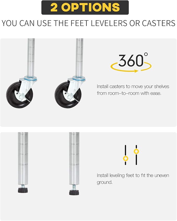 - HEAVY-DUTY & FLEXIBLE SETUP: Use feet levelers for up to 6000 lbs total (1000 lbs per shelf) or caster wheels for easy mobility, supporting up to 600 lbs when weight is evenly distributed.