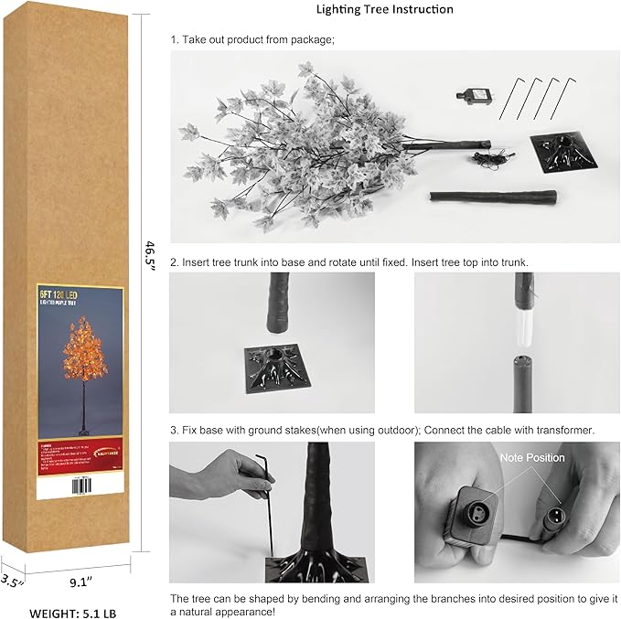 - Lighted maple tree with 120 warm white lights, natural looking maple leaves and brown finish trunk, patent protection.
