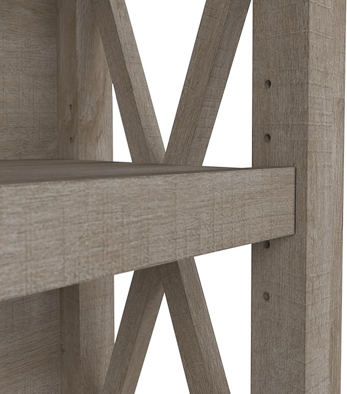 - MODERN FARMHOUSE STYLE: A sturdy post leg design, side panels with unique X pattern accents, and your choice of several slightly distressed finish options give this tall farmhouse bookshelf a look that works well in homes with casual style.