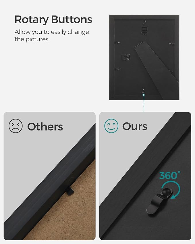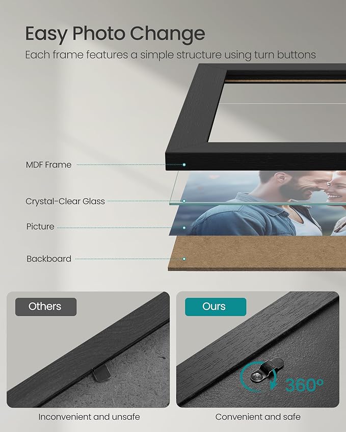 - [Change Pictures with Ease] With durable turn buttons on the back of each picture frame, you’ll be able to easily change your pictures every time you want to revisit your favorite family memories.