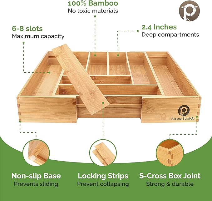 - SAFE FOR YOU & YOUR FAMILY: Our silverware holder is made up of the 100% highest quality Moso bamboo. We don't use the toxic MDF bottom like other bamboo silverware organizers - that means our flatware holder is safe for you and your family. 100% bamboo offers naturally water-resistant properties.