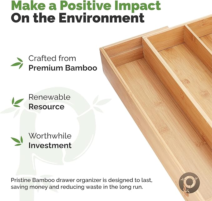 - ADJUSTABLE WIDTH & LOCKING MECHANISM: Innovative expandable sides lock in place when fully expanded, so you can choose between 6, 7, or 8 compartments to accommodate your desk supplies or various kitchen utensils of different sizes. Much better than ordinary bamboo drawer dividers. Expands from 12.5 inches to 19.3 inches. (Please measure your drawer carefully before ordering to avoid disappointment.)