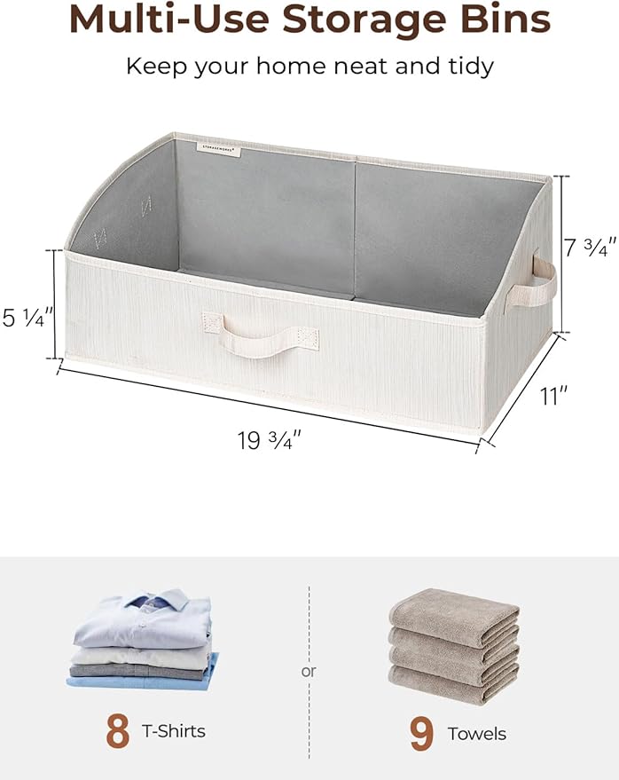 - Featuring a trapezoid design, these closet bins offer an open view and easy access to the items inside.