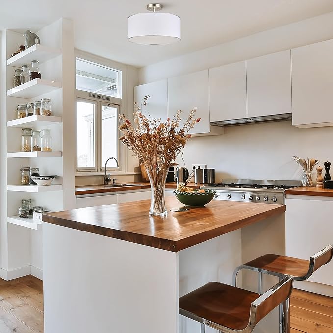 - Classic Charm Ceiling Light: Vonluce’s semi-flush mount ceiling light combines a stylish drum-shaped shade with a sleek brushed nickel canopy, adding timeless charm to any interior style, from classic and contemporary to industrial and modern