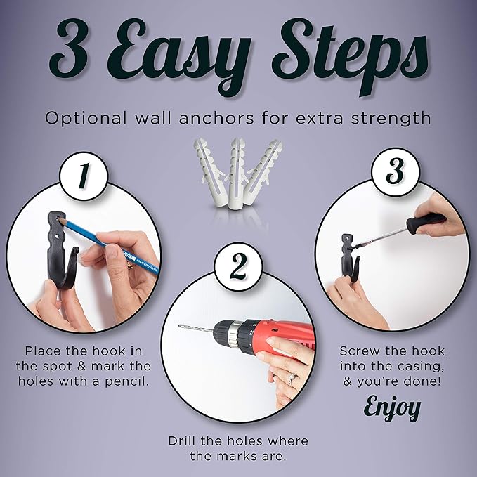 - Enjoy Quick & Easy Installation - Save time & money! No need to hire a handyman with our wrought iron hooks that you can install on your own. Comes with screws & wall anchors to ensure hassle-free installation.