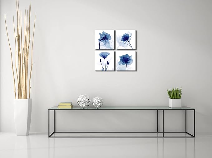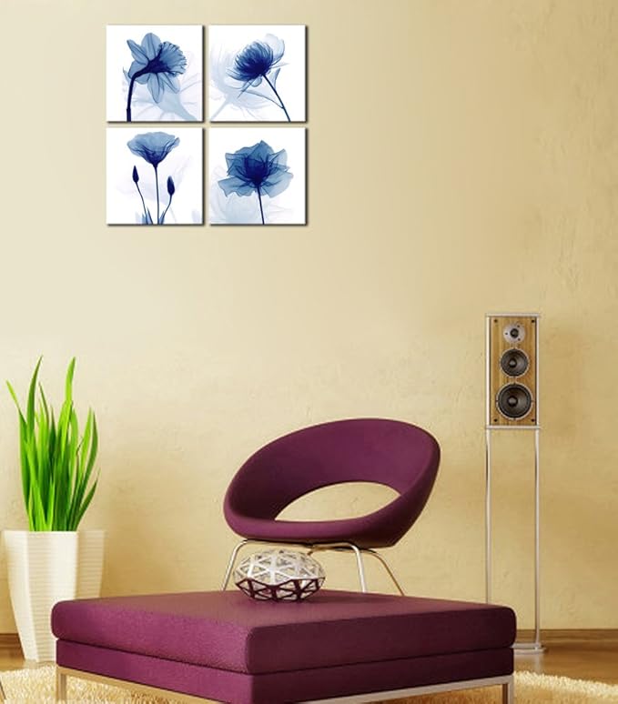 Pyradecor Blue Flickering Flower Modern Abstract Paintings Canvas Wall Art Gallery Wrapped Grace Floral Pictures on Canvas Prints 4 Panels Artwork for Living Room Bedroom Office Home Decorations