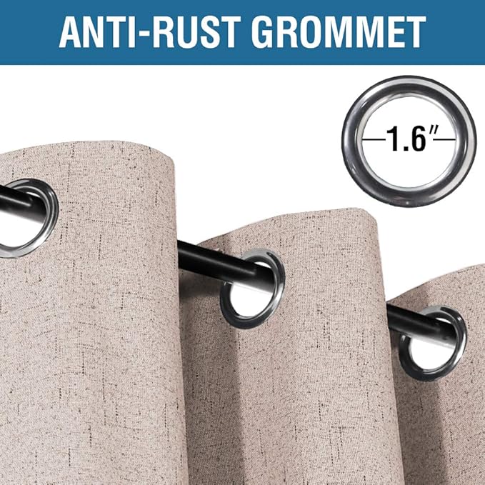 - 100% BLACKOUT: This elegant window panel is passed GLOBAL RECYCLED STANDARD certificate, crafted from rich faux linen textured fabric, inner woven construction features natural blackout effect, definitely block out 100% sun light and prevent harmful UV ray, this opaque piece totally darken your room, reduce the noise and gives you 100% privacy