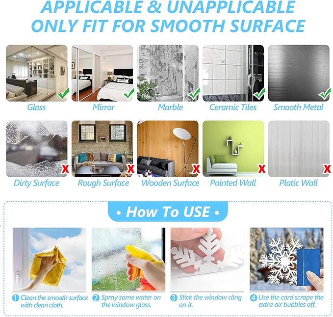 - PERFECT FOR ANY SMOOTH SURFACE: Christmas snowflakes window clings, fit for any smooth surface: sliding glass door, glass window, shop window, ceramic tiles, home appliance, etc. Great as Christmas stickers, Xmas decals, Static snowflakes stickers, snowflakes decals decorations, make amazing Christmas party supplies, Xmas decorations indoor ornaments, holiday home décor.