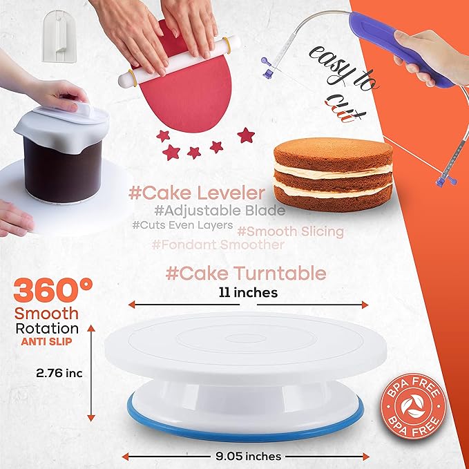 - ✅ Revolving Cake Turntable & Leveler - The 11 inches revolving cake decorating turntable features BPA-free food grade construction. The non-slip silicone base keeps the turntable firmly positioned while decorating cakes. The leveler with an ergonomic handle helps to cut through any type of cake and make layered cakes with ease.