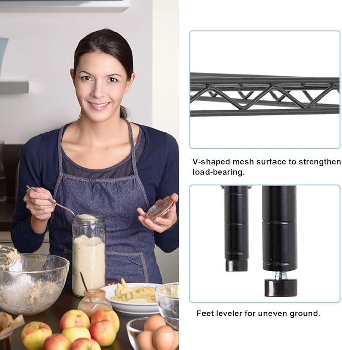 - √【ADJUSTABLE WIRE SHELF】: You can adjust the height of the storage shelves according to the size of the item;The spacing of each layer of this wire shelf can be adjusted;Shelves adjustable leveling feet allow the shelving unit to be placed on uneven ground--a simple twist is all it takes to stabilize;wire shelving unit wire shelf storage shelves