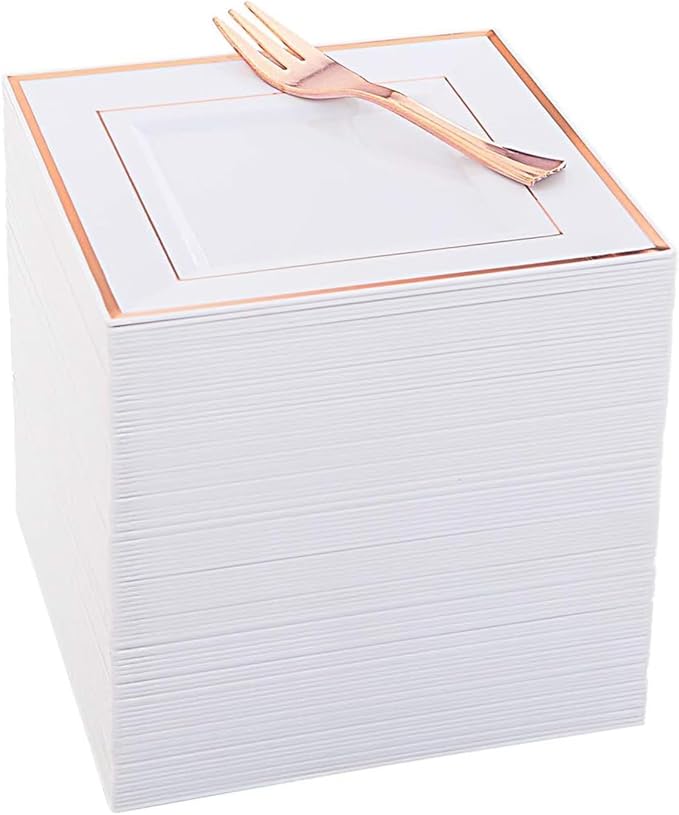 WDF 86pcs Rose Gold Dessert Plates 6" with 86 Pieces Disposable Forks 5", Elegant Square Appetizer Small Plastic Plates for Mother's Day, Wedding