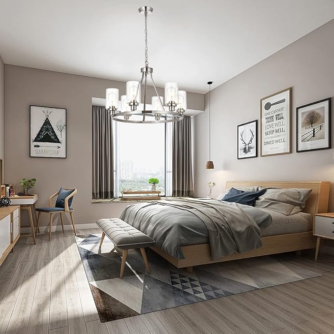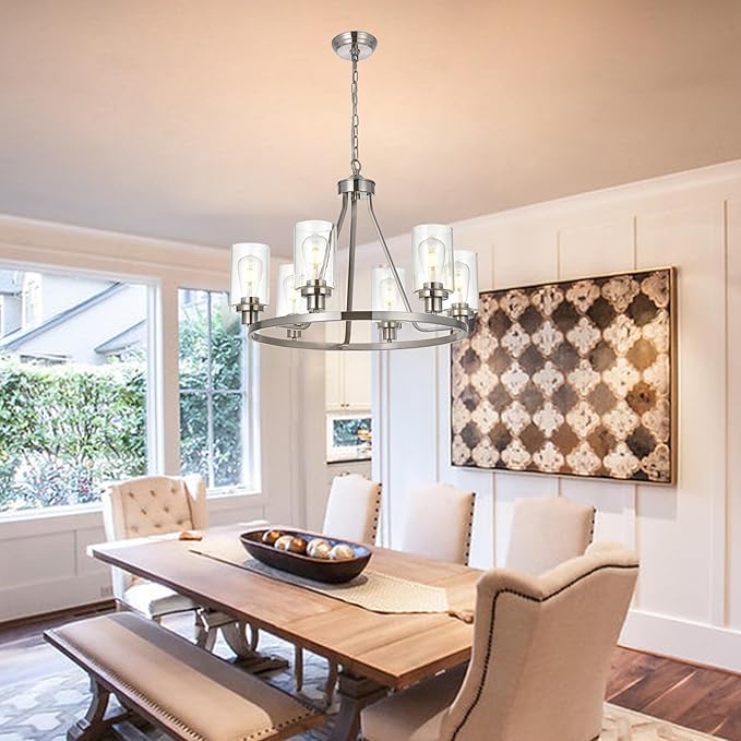 - DESIGN: This round chandelier offers a contemporary appearance with clean lines and a metallic brushed nickel finish. 6 lights sit atop a wagon wheel-inspired frame, each highlighted by a cylindrical clear glass shade to create an even gleam