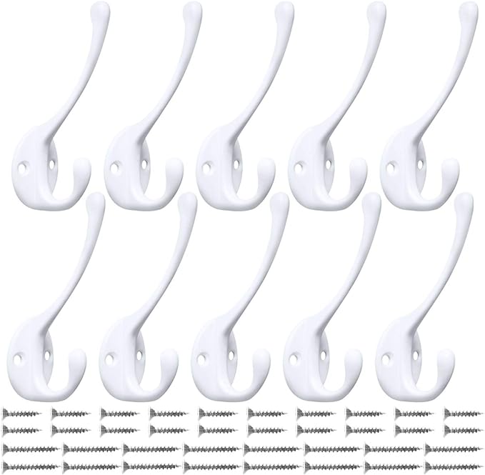 10 Pack Heavy Duty Dual Coat Hooks Wall Mounted with 20 Screws Retro Double Hooks Utility Black Hooks for Coat, Scarf, Bag, Towel, Key, Cap, Cup, Hat (White)