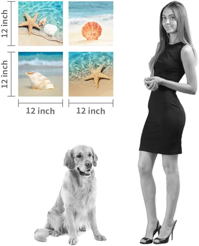 - Beach Canvas Art Wall Picture: A set includes 4 panel beach canvas pictures for walls (each panel size is 12x12 inches). Set the colorful seashell printed wall art decoration side by side. Clean dust on starfish canvas print wall decor lightly with a soft and lint-free cotton cloth. Copyright licensed image with high resolution definition