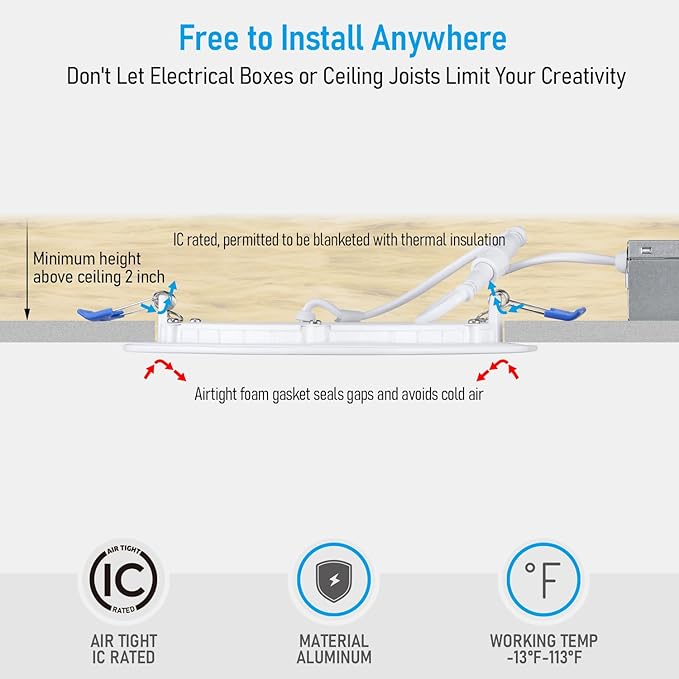 - Easy Install: Say goodbye to complex installations. Attach the included j-box to the LED recessed lighting using male/female cables, then secure it to the ceiling with the spring clip. This IC-rated light can directly contact insulation