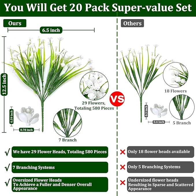 - 20 Pcs Artificial Flowers Set: You will get 20 pcs artificial flowers for outdoors decoration, Each plastic flowers have 7 flexible stems and 29 flower heads, making it denser than the 5 stems, 18 heads