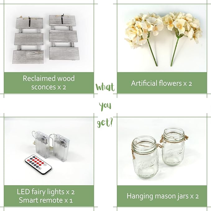 - Farmhouse Wall Sconces Set of Two – Each set includes includes 2 wall sconces, 2 mason jars, 2 artificial hydrangea flowers, 2 LED fairy lights, and 1 mini remote.