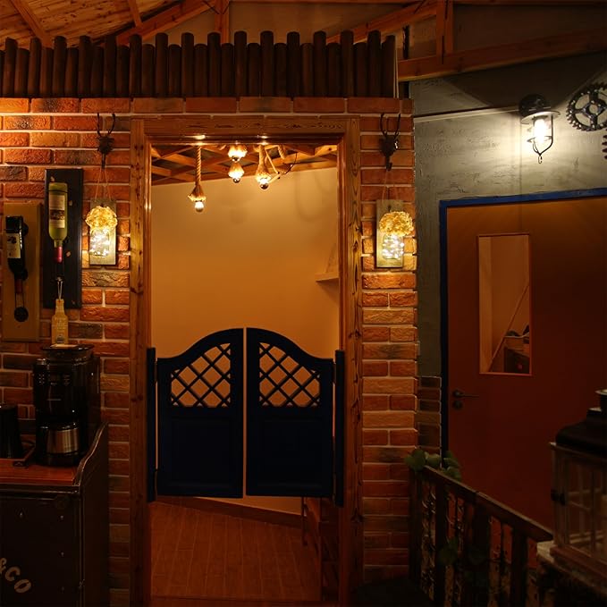 - Convenient Remote & Timer Function – Each rustic wall sconce comes with LED string lights powered by 3*AA batteries (not included), offering 8 lighting modes and a timer setting (2/4/6/8 hours). Perfect for effortless home wall decor for living room or bedroom ambiance.