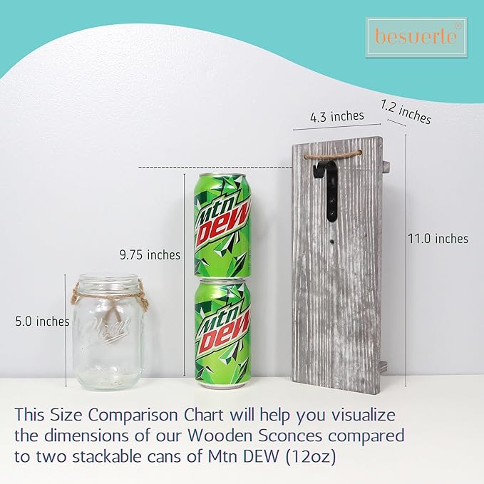 - Crafted from Natural Wood – Each wall sconce features unique textures and colors, measuring 11" H x 4.3" W, and includes hanging mason jars with artificial flowers for a charming rustic farmhouse touch.