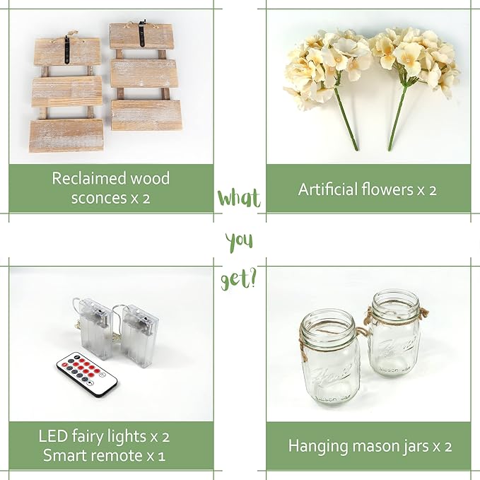 - Convenient Remote & Timer Function – This set of two rustic wall sconces include LED string lights powered by 3*AA batteries (not included) with 8 lighting modes and a 2/4/6/8-hour timer, Lights turn on/off automatically for convenience and energy savings.