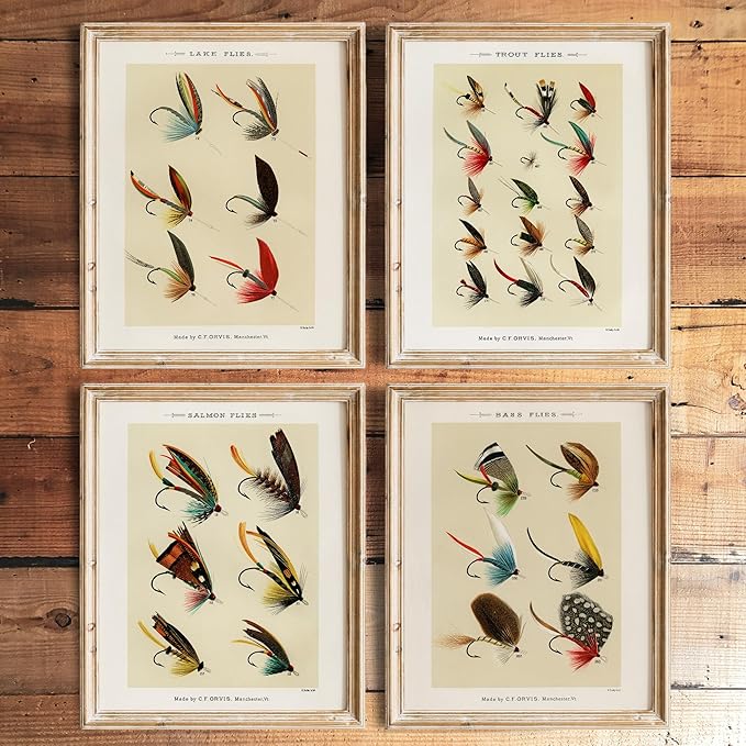 Vintage Fly Fishing Art Prints (Set of 4) - Unframed - 8x10 | Great Gift for Fisherman - Reproductions of Vintage Fishing Lure Drawings - Rustic Decor
