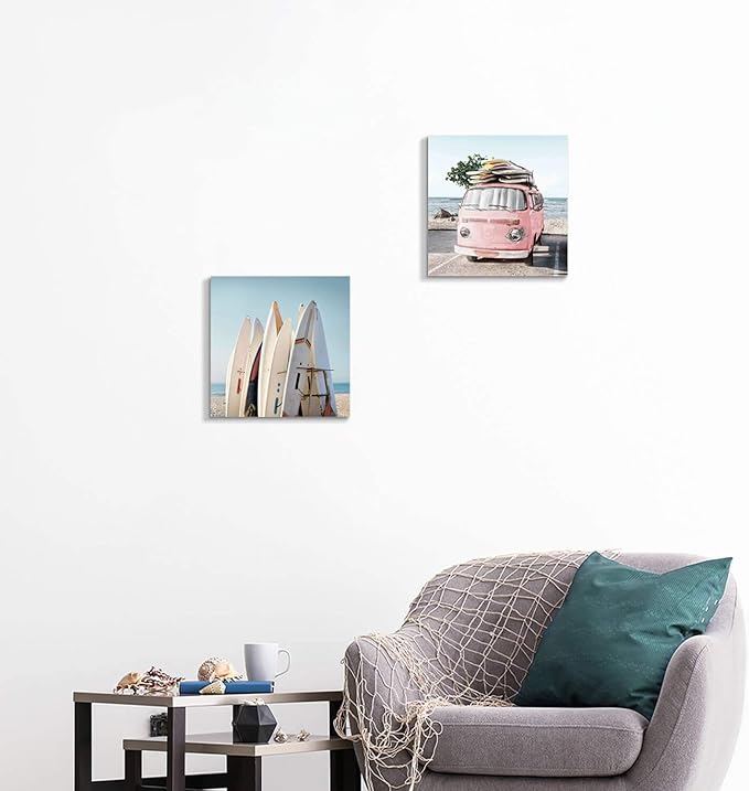 Beach Picture Coastal Art Painting: Surfboard & Pink Car Ocean Wall Art on Canvas for Bedroom Bathroom (12” x 12” x 2 Panels)