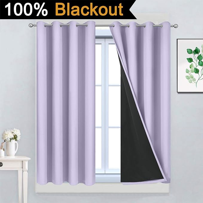 Yakamok Full Blackout Curtains 45 Inches Long,Blackout Curtain Panels for Bedroom, 2 Thick Layers Grommet Top Thermal Insulated Drapes with Black Liner for Living Room(52Wx45L, Lilac, Set of 2)