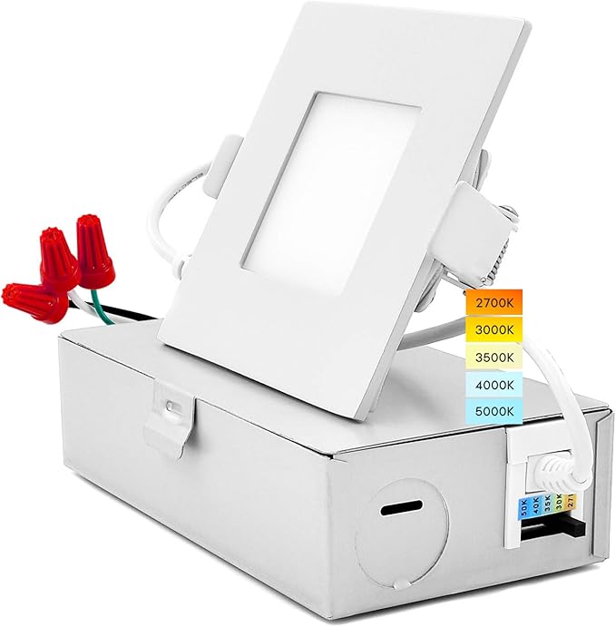 - 5 COLOR OPTIONS - Not sure what square recessed lighting color temperature you are looking for in your home? Each LED downlight has a simple to use switch connected that can change your lights to 2700K warm white, 3000K soft white, 3500K natural white, 4000K cool white, or 5000K bright white. Your home recessed ceiling lights will be adjustable through 5 color temperatures until you find the perfect light to select for your space.