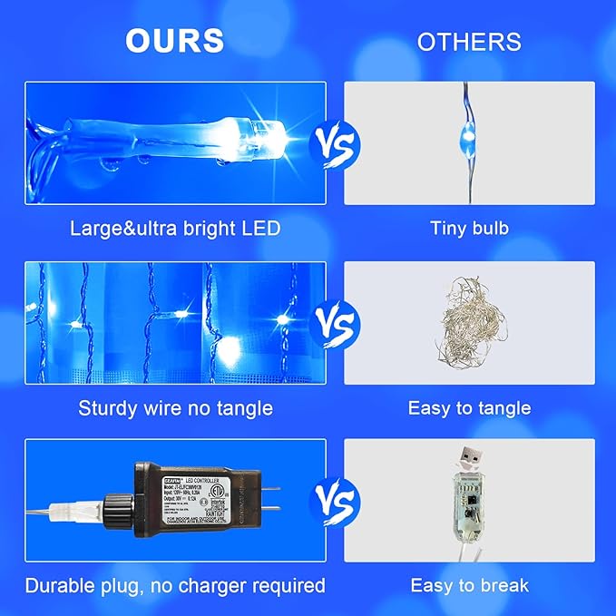 - Great Decorations for Indoor-outdoor: Our blue Christmas curtain lights are outdoor waterproof (IP44), withstand rain and snow, and are ideal for outdoor use. It can be used for outdoor decor, such as gazebos, fences, lawns, and party backdrops. These backdrop curtain lights are what you are looking for, it is so mesmerizing! Note: the plug is NOT waterproof, please put it in a dry place.