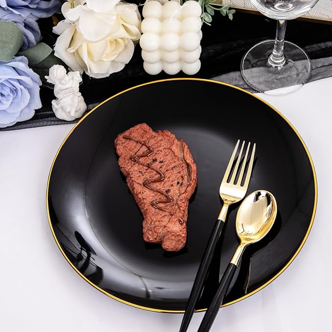 - Elegant Appearance: 10.25inch gold plastic plates can hold more food and the gold rim make black and gold plates look more refined and luxurious.
