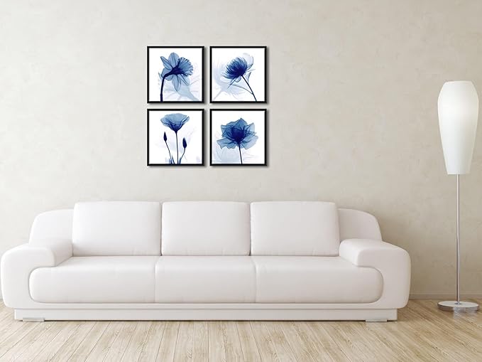 Pyradecor Black Framed Wall Art Blue Flickering Flower Modern Paintings Canvas Artwork 4 Panels Grace Floral Pictures on Canvas Prints for Bedroom Office Home Decorations