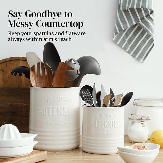 - Large and Deep Ceramic Cooking Utensil Holder: With a generous size of 7.2″H x 6.2″W, this super large container is designed to hold 15-20 cooking utensils, ensuring your tools are always easy to access when you need them most. From spoons and whisks to spatulas and more, this utensil storage comfortably accommodates utensils ranging from 10 to 16 inches in length, keeping them tidy and ready for use.