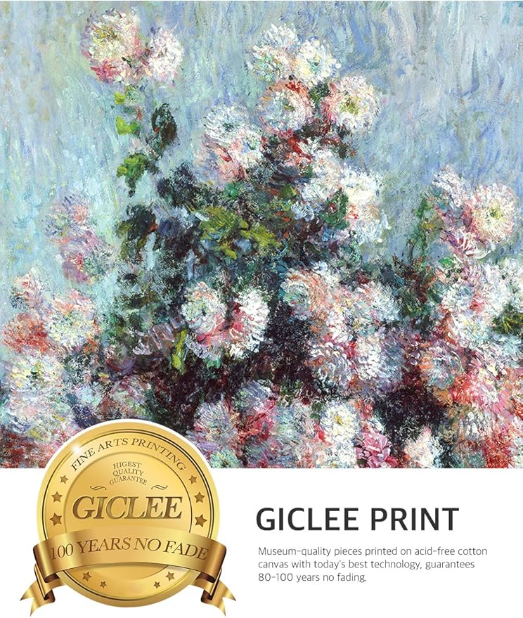 - Timeless Monet Art - Bring Claude Monet's Chrysanthemums (1882) into your home. This impressionist wall art fills your room with warmth and elegance, creating a refined focal point for any decor style.