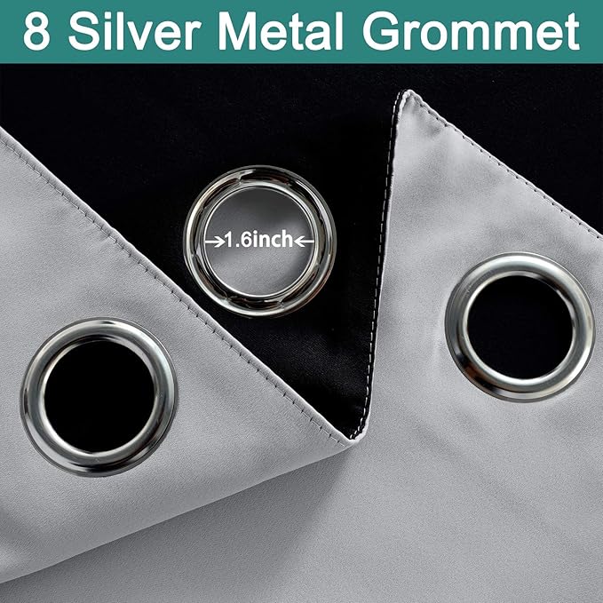 - PACKAGE MADE:2 panels per package. Each Lined Curtain measures 52" wide x 72" long. 8 Silvery Grommets per panel. This silvery grommet (1.6 inch inner diameter) fits many rods. Easy to hang and smooth to slide. The simple design gives people a sense of ease.