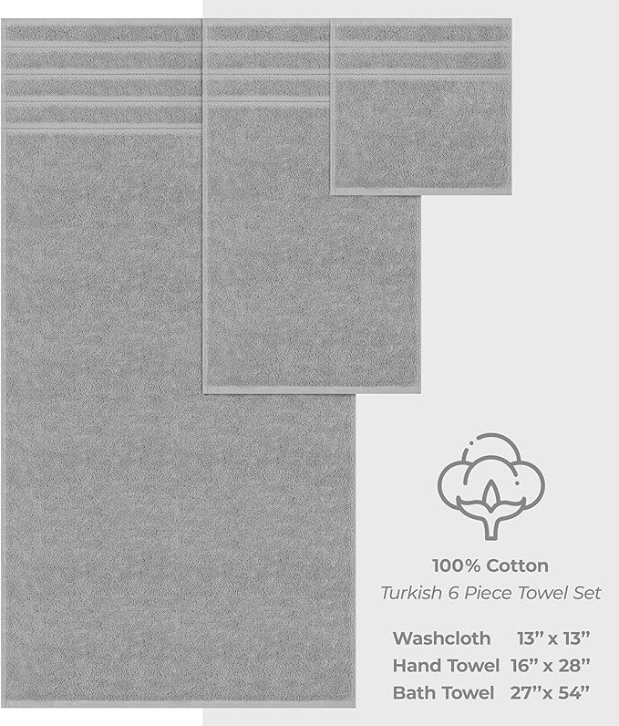 - ✅ Turkish Luxury 6 Piece Towel Set Includes 2 Bath Towels of 27 x 54 inches, 2 Hand Towels of 16 x 28 inches and 2 Washcloths of 13 x 13 inches.