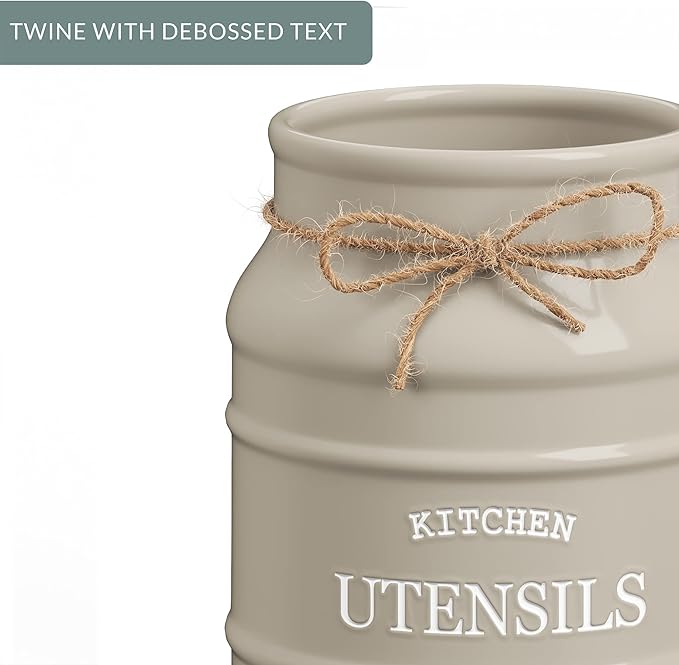 - Ceramic Utensil Holder - Decorate, organize, and beautifully display your cooking utensils in this farmhouse kitchen utensil holder. A decorative kitchen utensil holder for your countertop that will keep your kitchen neat and free of clutter.