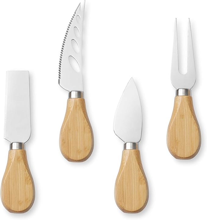 - 4 Stainless steel utensils: Hidden within the convenient slide-out trays, you will find four stainless steel cheese serving utensils. Each of these serving utensils, used for slicing and spreading cheese, feature a matching bamboo handle.