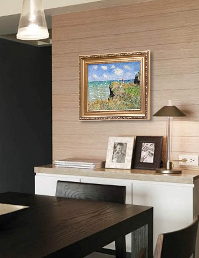 DECORARTS - The Cliff Walk At Pourville by Claude Monet. Classic Art Reproduction, Giclee Print on Canvas. Ready to Hang Framed Wall Art for Wall Decor. Total Size w/Frame: 26x22
