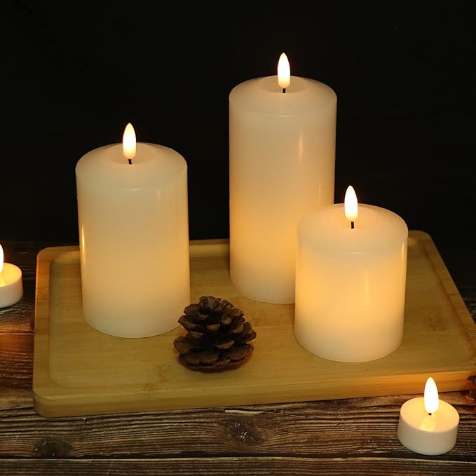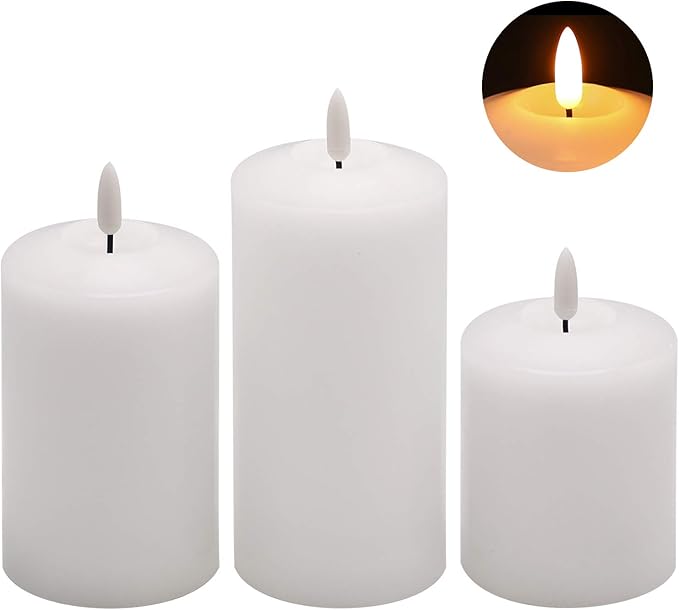 - Real Wax: Made of high-quality unscented paraffin wax in pure white color and smooth finish, each candle is 3 inch wide and 4.6”, 5.8” and 6.8” tall, requires 3 type AAA batteries (not included).