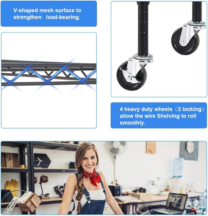 - HEAVY-DUTY & VERSATILE STORAGE: Reinforced steel with V-shaped mesh holds up to 2100 lbs total (350 lbs per shelf) with feet levelers, or 510 lbs total with caster wheels for easy mobility.