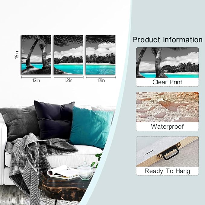 SkenoArt 3 Panels Teal Canvas Wall Art Black and White Hawaii Beach Pictures Tropical Palm Tree Artwork Giclee Prints for Bathroom Office Wall Decoration Framed Ready to Hang Each Piece 12"x16"