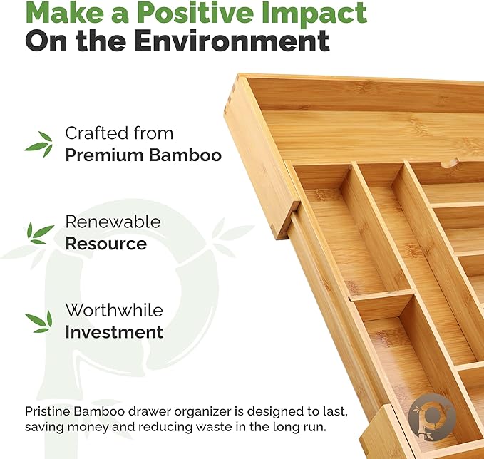- Fit your drawer perfectly - Our bamboo silverware drawer organizer is designed with 8-10 compartments. Thanks to its adjustable features, our expandable drawer organizer can be expanded from 10 to 15 inch wide, Perfect for any kitchen drawers.