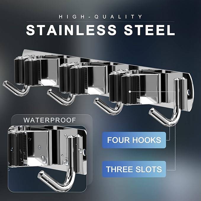 - 🏡【STURDY BROOM HOLDER】Each broom holder wall mount has 3 racks 4 hooks. Made of sturdy 304 stainless steel, the broom holder is corrosion-resistant, rustproof and waterproof. Compared with the plastic broom rack, it is more stronger and has a longer service life.