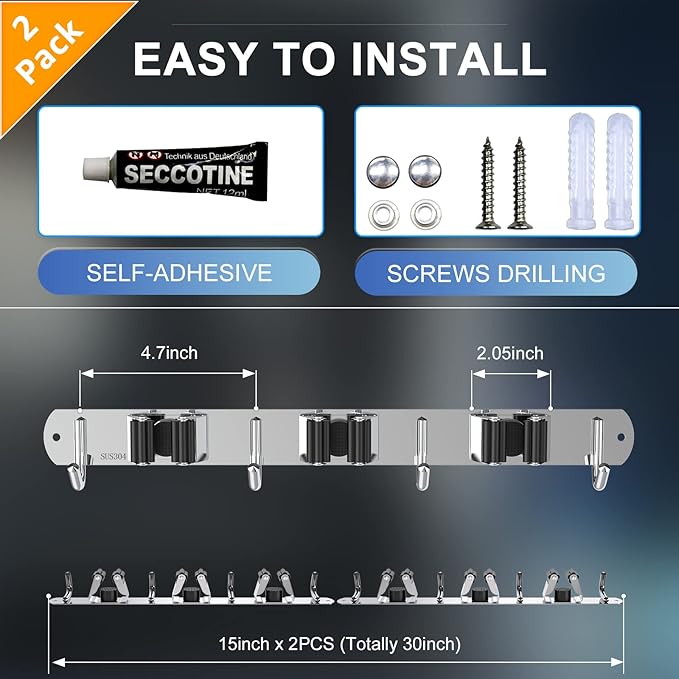 - 🏡【EASY TO INSTALL & USE】There are two ways to install the broom hanger wall mount, screws drilling and self-adhesive, which is suitable for different installation surfaces. Please follow the clear instructions step by step, even the clumsiest of us can install easily in just minutes!