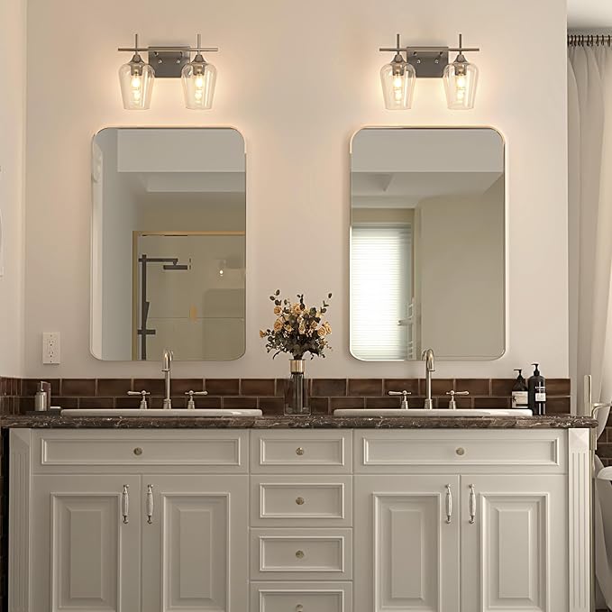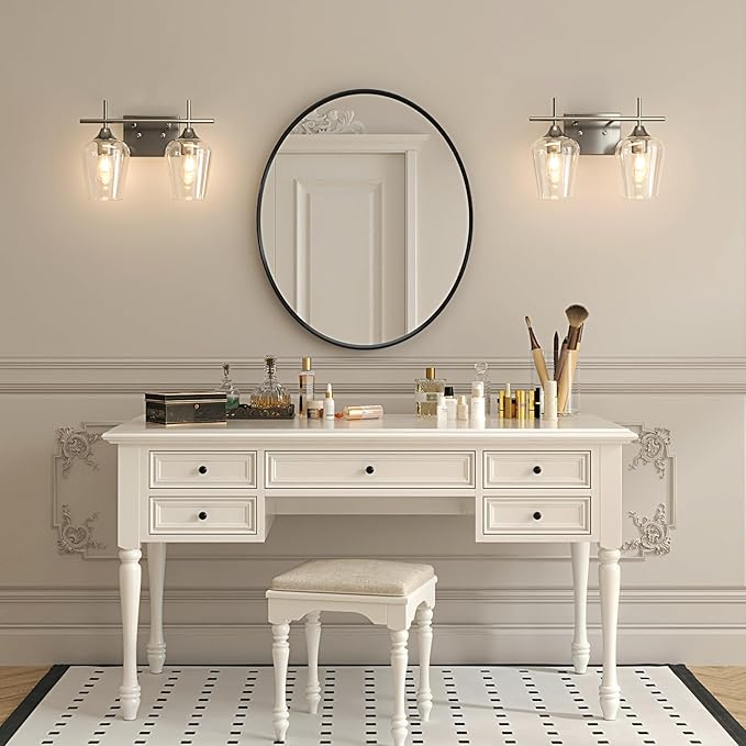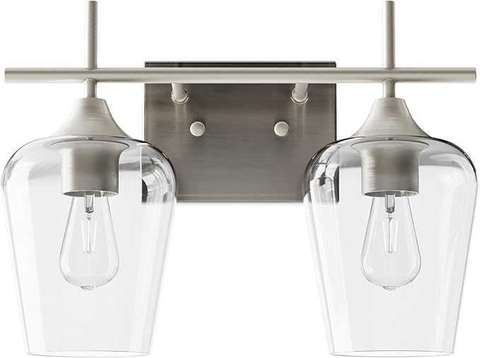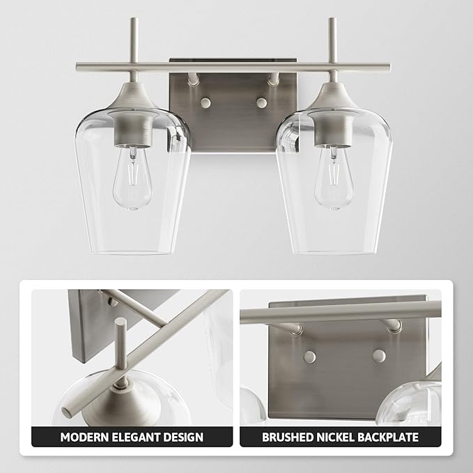 - Timeless Modern Design: This 2-light vanity light blends modern industrial style with minimalist elegance. Made with nickel-finish metal and clear glass shades, it adds a sleek, contemporary touch to enhance any room’s aesthetic