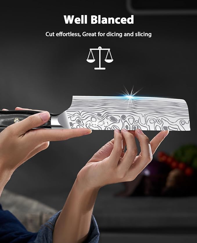 - 【Perfect Size and Weight】The standard length of the nakiri chef knife is 7-inch and is much easier to manipulate for different functions such as chopping, mincing, dicing, and slicing. Our chef's knife weighs 8.8 oz, which makes you feel more durable and effortless to cuts easily through large pieces of food.