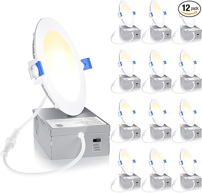 Ensenior 12 Pack 4 Inch LED Recessed Light, Dimmable, 3000K-5000K 3CCT, 750LM High Brightness, 9W 120V, Damp Rated, Ultra-Thin Canless Wafer Ceiling Light - ETL & FCC & IC
