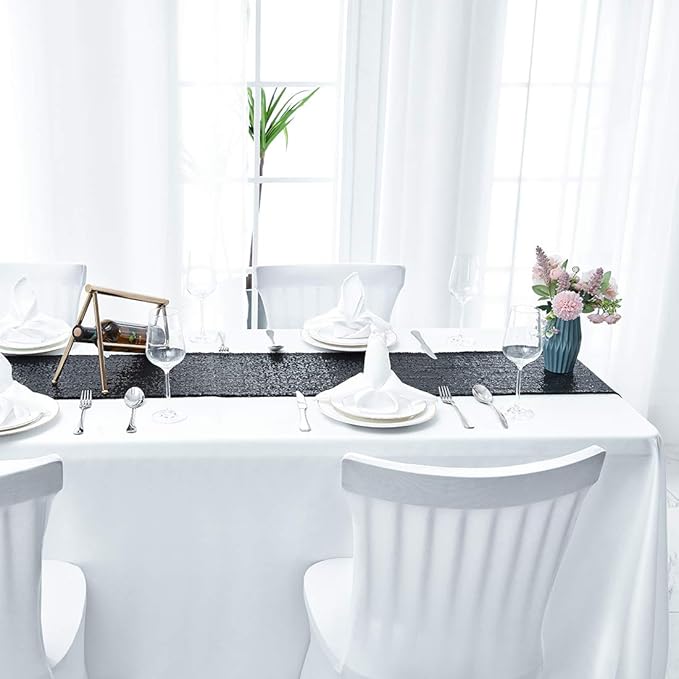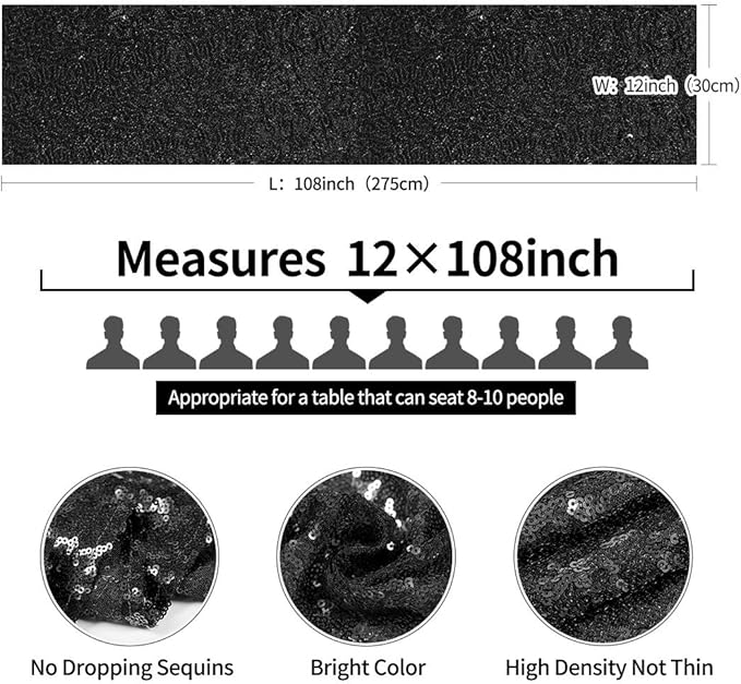 - Size: The 12" x 108" black sequin table runner is suitable for tables that can accommodate 8-10 people. Buy bigger pack, save more.